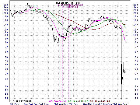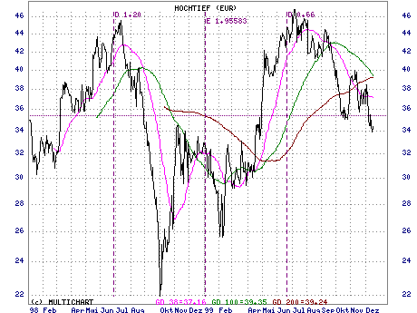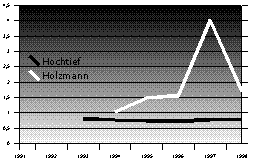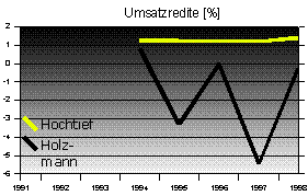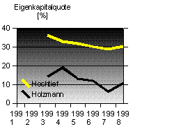 Allgemein ist zu sagen, daß im Baugewerbe die Umsatzredite im Vergleich zu anderen Industriezweigen sehr gering ist. Dies ist eine folge von Überkapazitäten in der Baubranche und dem daraus resultierenden sehr starken Wettbewerbs- und Preisdruck. So sind z.B. in verschiedenen Dienstleistungsbranchen oder der Softwareindustrie Umsatzrediten von über 10% keine Seltenheit. Hochtief schafte es im letzten Geschäftsjahr sogar, seine Umsatzrendite von 1,2% in den Vorjahren auf 1,39% in 1998 zu steigern. Dies ist darauf zurückzuführen, das die Leistung zurückging und der Gewinn sogar gestiegen ist. So wurden nach Angaben von Hochtief selektiv Aufträge angenommen, die aussichtsreichere Ertagschancen bieten. |